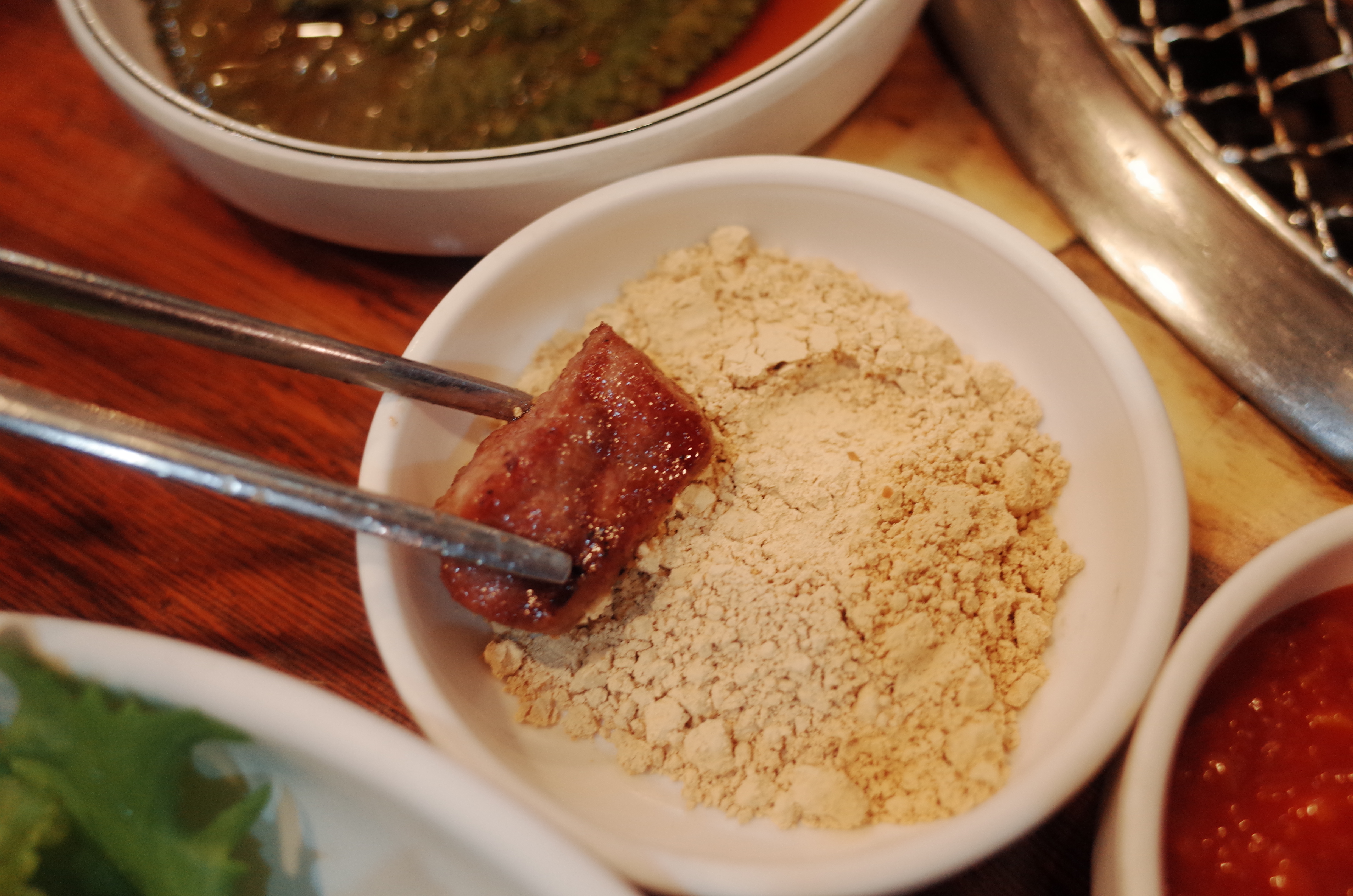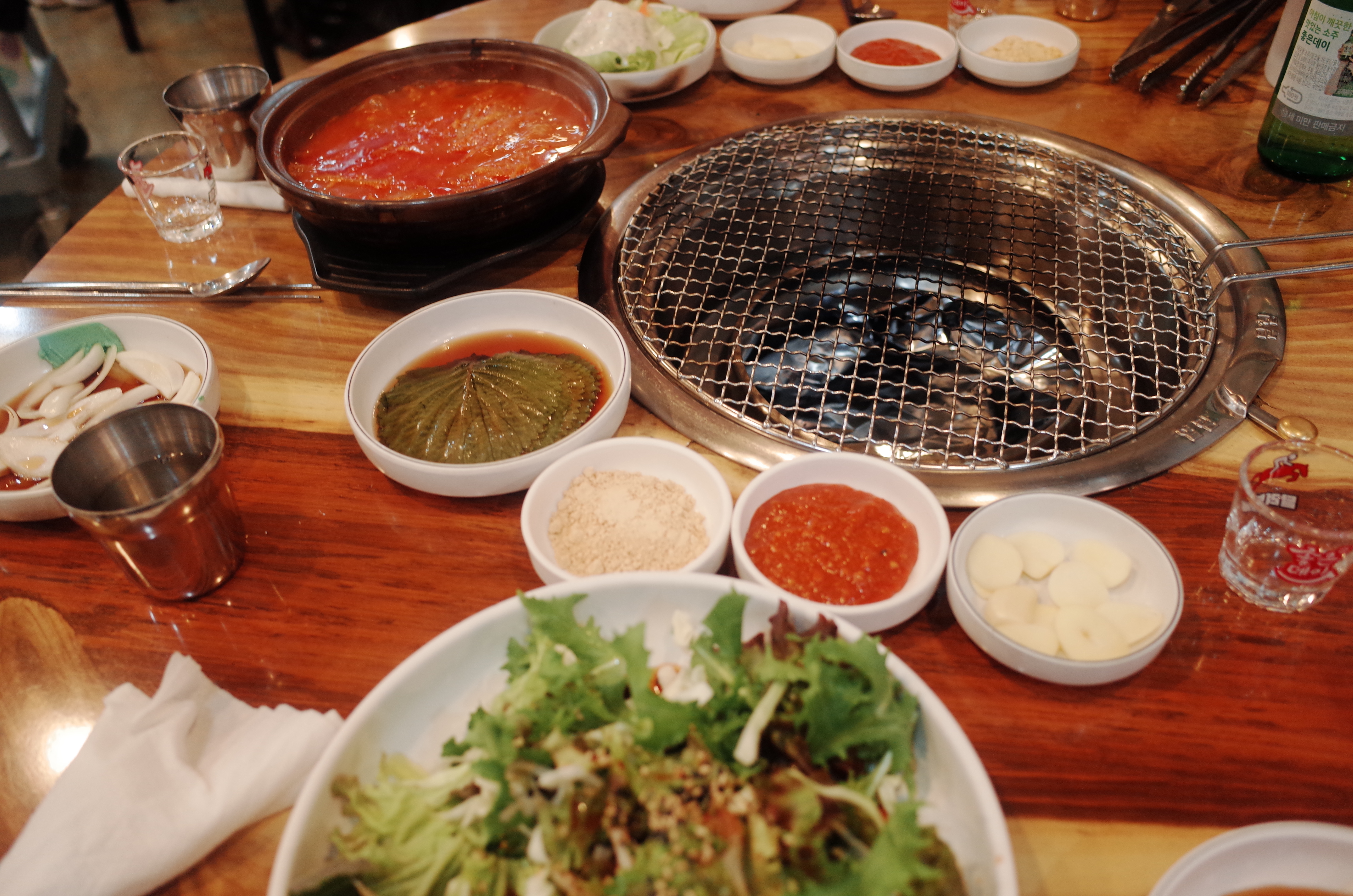 기본 상차림은 정말 훌륭했다. 고기하고 쌈 싸서 먹을 때 맛있을 것 같은 기본 반찬들이 세팅되고 가장 좋았던 것은 국물도 같이 나와서 고기를 구우면서도 한잔할 수 있는 시간이 생겨서 좋았다.