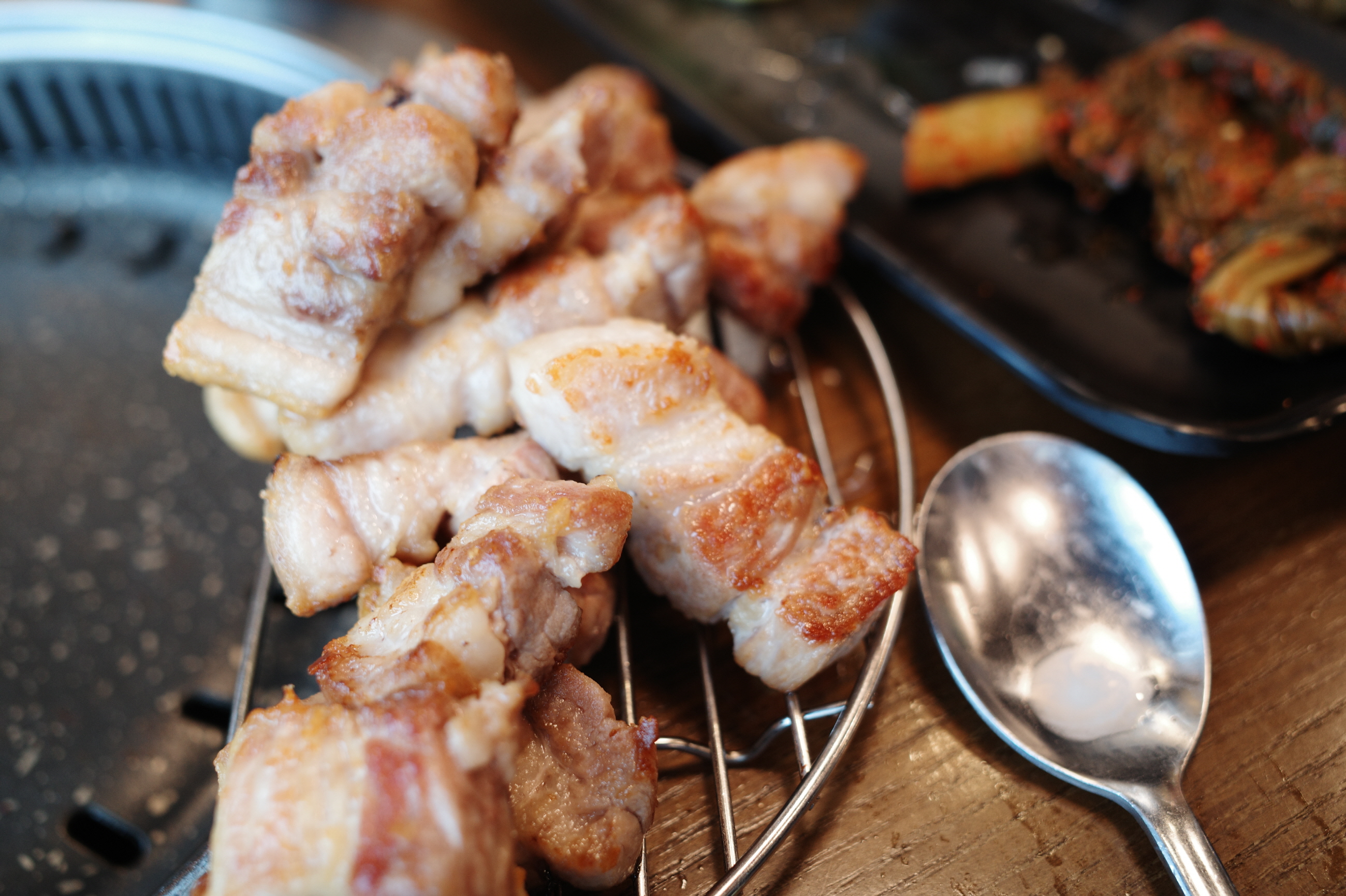 울산 삼산동 숙성 삼겹살 맛집 숙달돼지의 장점은 고깃집에 와서 고기를 굽지 않아도 된다는 것도 큰 장점입니다. 직원분들께서 직접 다 구워서 만들어주시기에 먹는 것이 큰 어려움이 없어요! 우리가 술 마시면서 구우면 고기를 태울 수 있는데 직원분들께서 친절히 다 해주시기에 먹는 것에만 집중할 수 있어요.