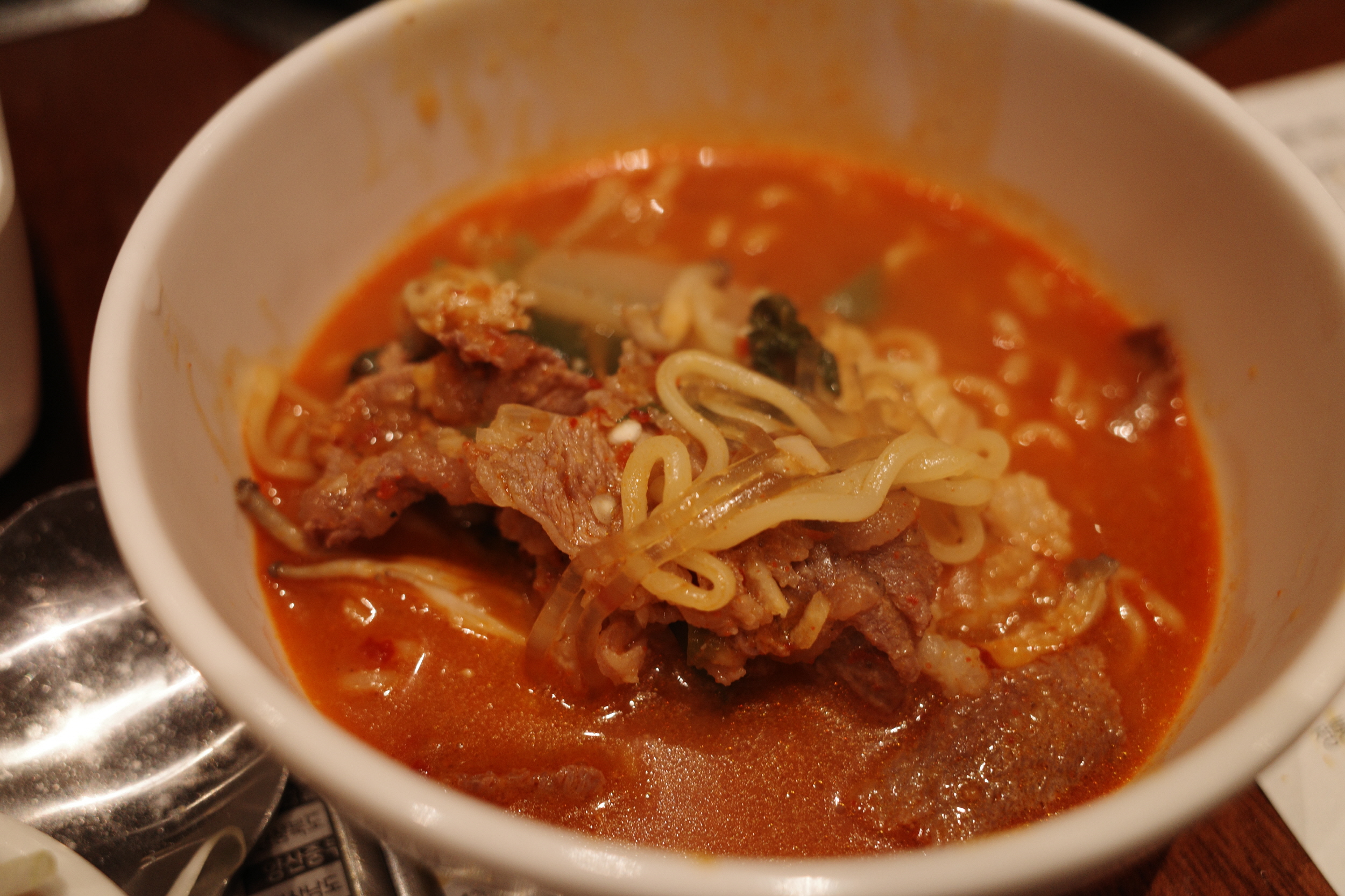 마지막에 찌개를 하나 주문하고 그리고 라면 사리까지 추가해서 탄수화물 폭탄으로 만들어버렸습니다. 소주가 항상 마지막에는 애매하게 남아서 추가적으로 안주를 주문해야 하는 것 같아요. 일종의 법칙 같은 느낌을 받네요. 그래도 맛있는 고깃집에서 소주와 함께 달릴 수 있어서 너무 좋았습니다.